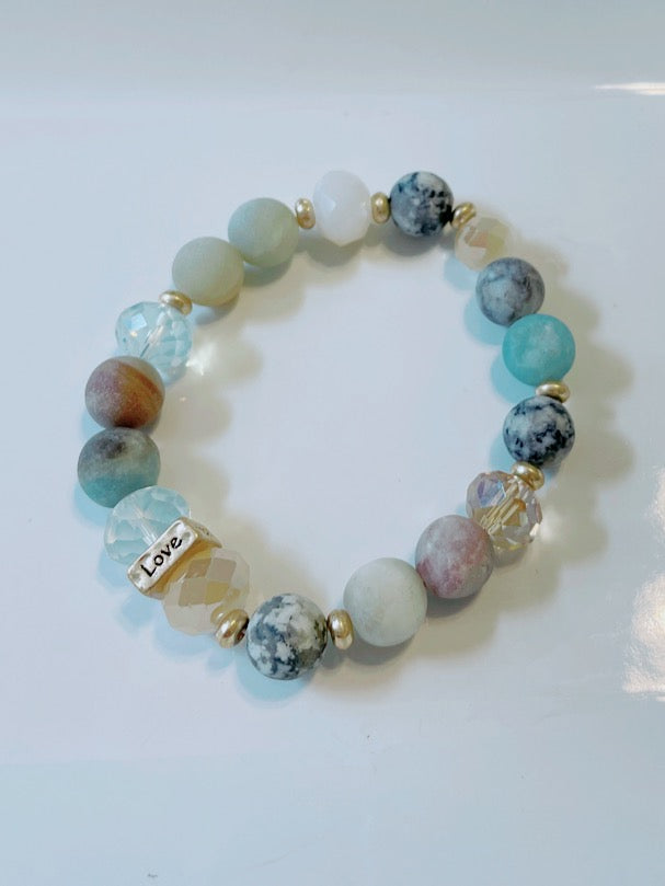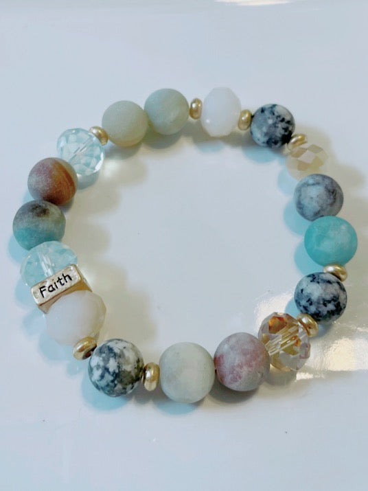 Gorgeous Natural Amazonite stretch bracelet. Adorned with Faith, Love, Hope and Blessed.