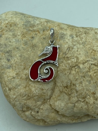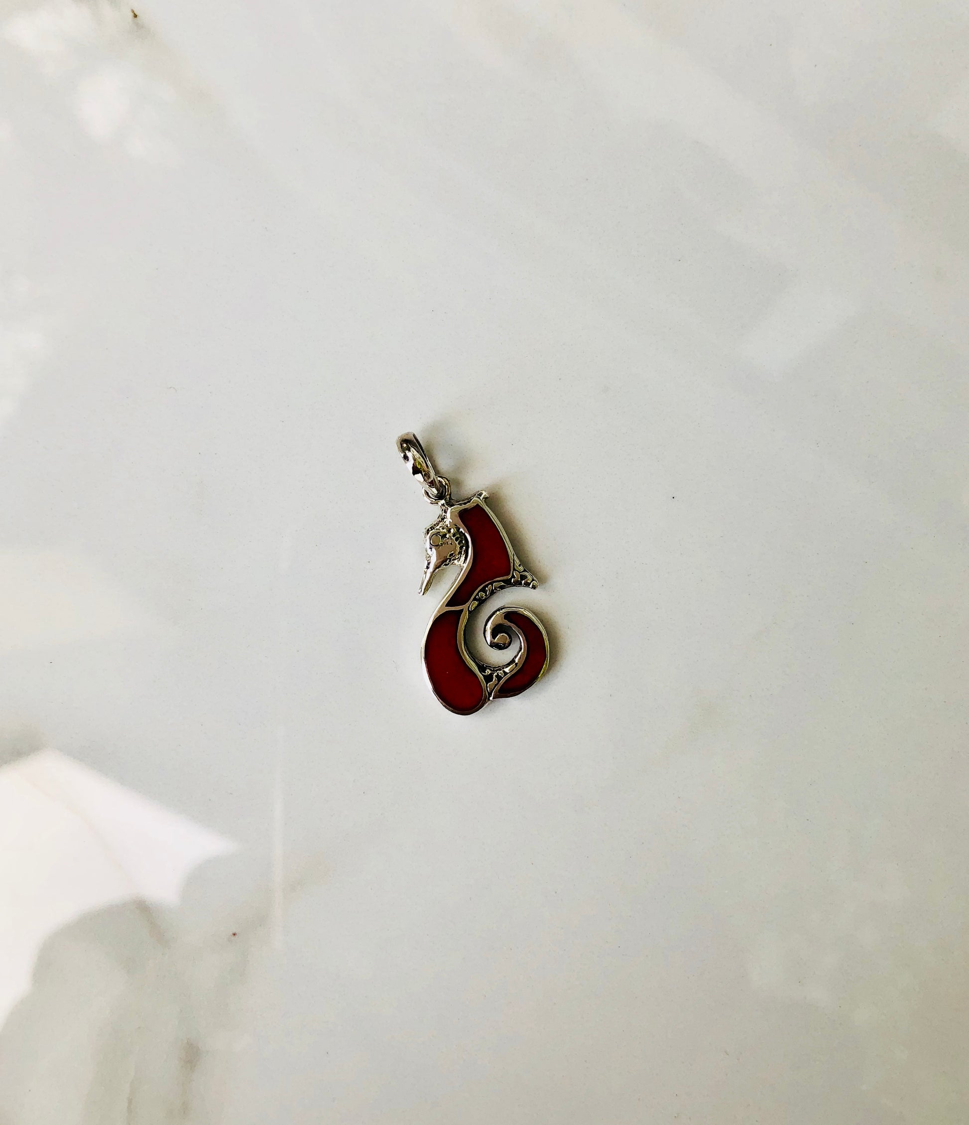 Enhanced Sponge Coral Sea Horse Pendant. Really lovely silver work, great rich red color.
