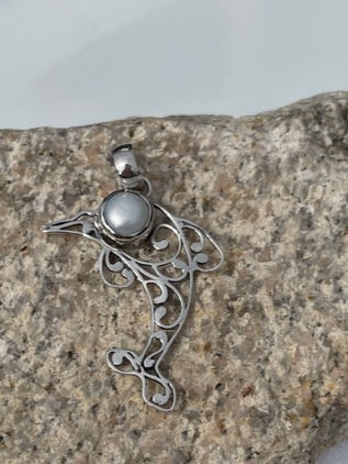 I love the silver work on this pendant and the pearl is lovely. For the dolphin lover!