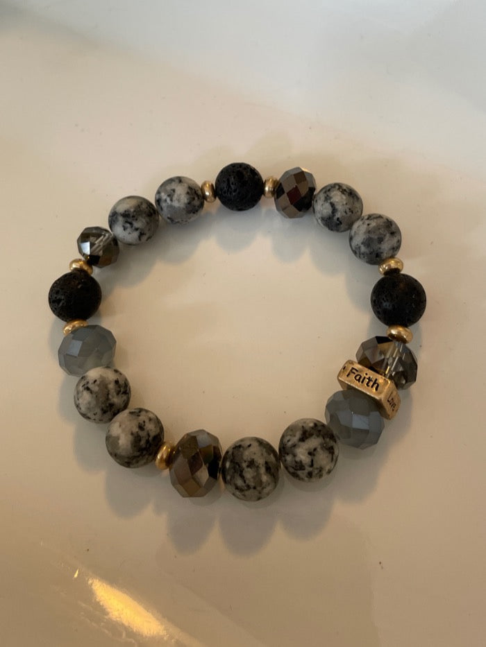 Rich black Lava stone stretch bracelet adorned with Faith, Love Hope and Blessed Bead.